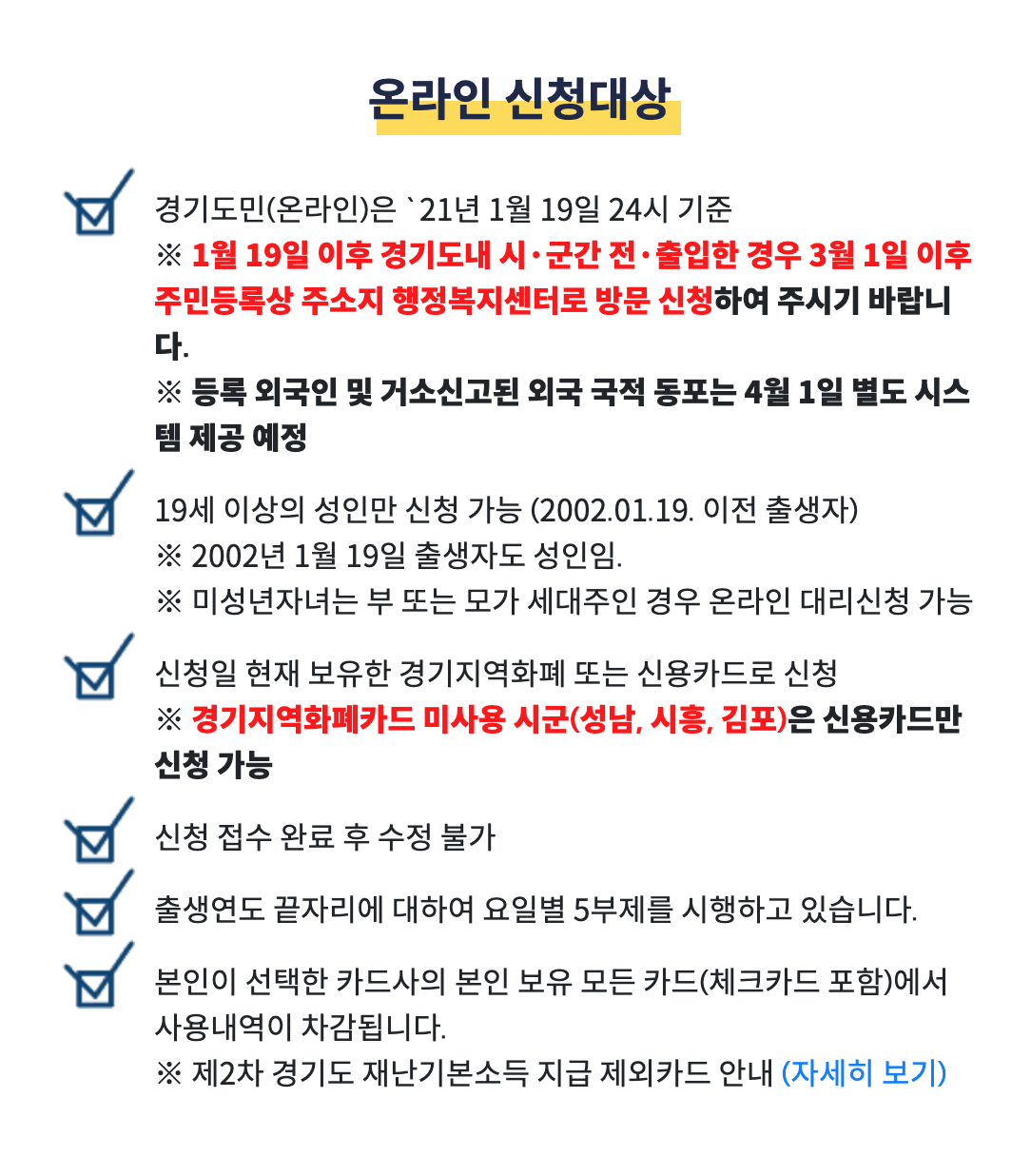 하지만 주의하셔야 할 부분이 있는데요. 거주지 기준일이 2021년 1월 19일 24시부터라서, 이 이후에 경기도 거주 신고가 되셨거나, 부합할 경우 경기도 재난지원금 대상에서 제외되니, 꼭 확인하시는 것이 좋습니다. 추가로 재난지원금 지급 대상 중 임신한 임산부의 경우, 임산부의 배안에 있는 태아도 재난지원금 지급 대상에 해당할 수 있다고 합니다. 조건은 위에 언급했던 기준일에 부모 중 한명이 경기도민이면서 신청기간 내에 출생한 경우입니다. 참고하시길 바랍니다.