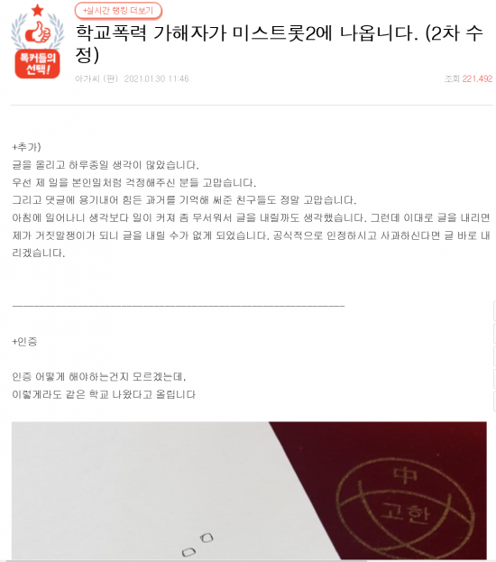 안타깝지만, 이번 학교폭력 논란의 가해자인 진달래도 본인의 잘못을 인정하였고, 피해자가 느꼈던 공포감과 상처는 씼을 수 없는 가해자의 잘못입니다. 학창시절 그런 잘못을 저지르지만 않았어도 미스트롯2에서는 물론, 앞으로 가수생활의 앞날은 창창했을텐데 그렇지 못해 아쉽지만, 피해자의 상처는 씻을 수 없습니다. 피해자분의 용기와 그때 받은 상처가 치유되기를 응원합니다.