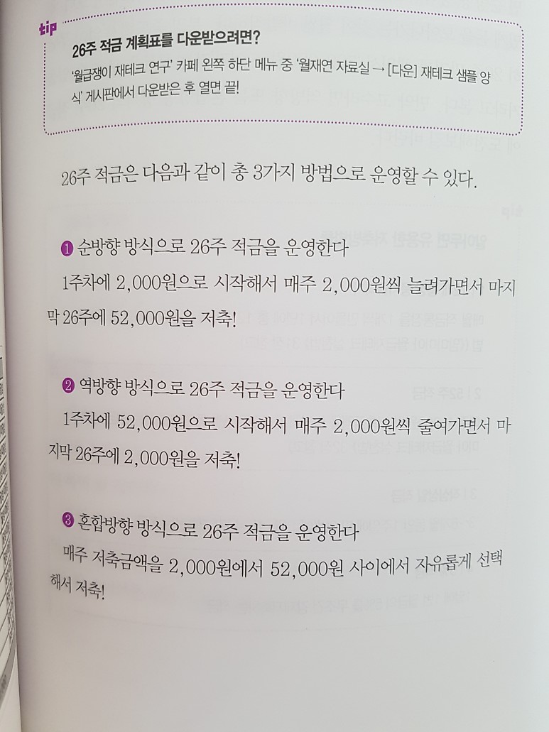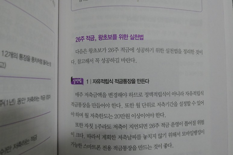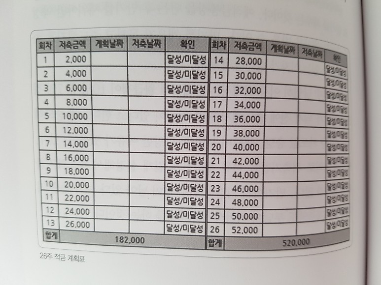 26주 적금 수단이 자세하게 작성되어 있다!!!!:).꾸준한 금액이 아니라 늘려가는 금액이라서 자유적립식 적금통장을 만들어야 되는데,만들 때, 확인해보아야 하는 내용이 있다!!!!:)남은1/3부분 금액이 저축한 2/3금액을 넘을 수 없는 적금 통장이 있기 떼문에거꾸로 적금을 (52,000원부터 2천 원씩 줄이는 수단) 하지 않을 때,마지막에 입금을 못 할 수 있으니 주의사항을 꼼꼼히 읽어 보세요.전 예전 52주 만들 때, 일반 입출금 통장으로 했던 거 같아요.이자보다는 매주 적금하는 연습을 기르기 위해서 그랬는데, 결국엔 성공 못 했어요..