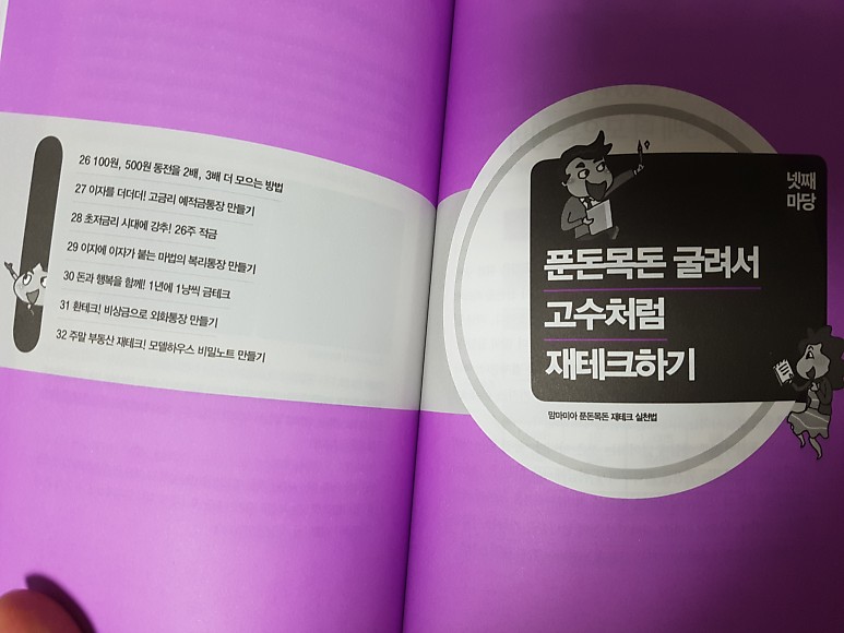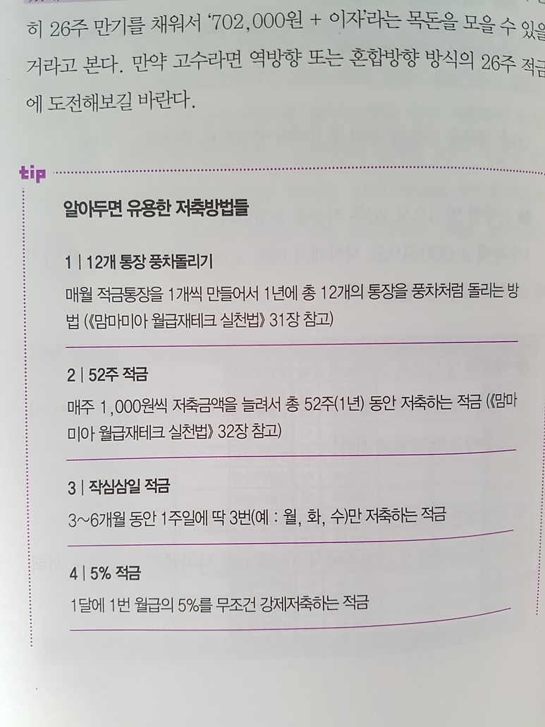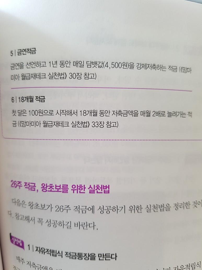 푼돈목돈재테크 읽으면서 첨 알게 된 26주 적금12개 통장 풍차 돌리기는 제 용돈으로 성공한 적이 있다!!!!:).용돈 20만 원으로 월 만 원씩 한 개씩 늘려가는 재미로8개째부터 무리였지만 끝까지 버텨 1호 만기 때부터는 진짜 행복하더라고요.52주 적금은 하다가 중도 포기했었는데,26주 (6개월)은 도전할 만한 적금이라, 시도해 보고 싶네요.