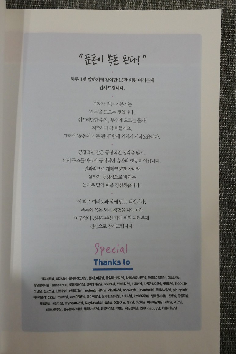 저자마음마미아출판진서원발매2016.09.05.하루 1번 말하기 미션 푼돈이 목돈 된다.긍정적인 말은 뇌의 구조를 바꿔 긍정적인 버릇과 행동을 이끌어 내앞서 카페 회원들의 재테크뿐만 아니라 삶까지 긍정적으로 바뀌는 나쁘지않은 말