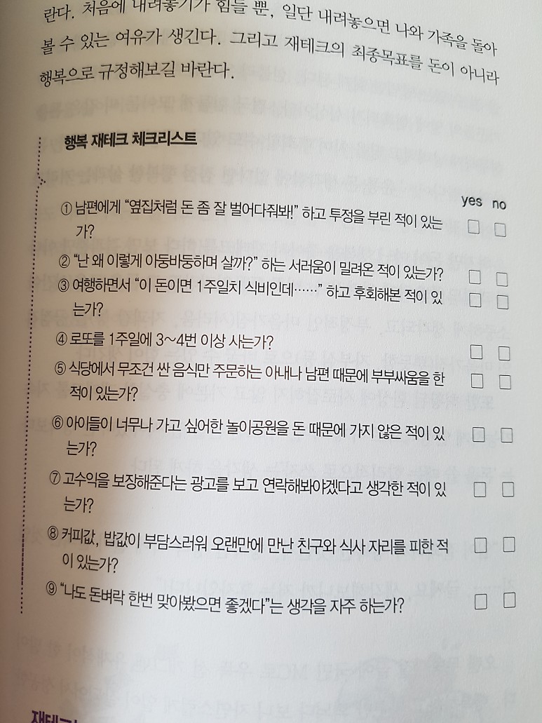 행복 재테크 체크 레스트9가지 항목 중 5~ 7개 이상에 "예"라고 답했다면너무 돈돈 거리면서 사는 거라고 해요.저는 다행스럽게 2번 한 개만 "예"라고 대답했네요.