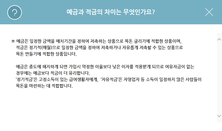 저축을 한다는 것은 은행에 돈을 모으는 것을 의미한다.그런데 저축에는 크게 2가지가 있다. 적금과 예금.목돈을 만드는 방안으로 우리가 알고 있는 것은 적금이라는 상품이다.매달 얼마씩 몇년동안 꼬박꼬박 모아나가는 것. 이것이 적금이다.반면 예금은 예치금이다. 즉 매달 일정비용을 은행에 넣는것이 아닌 한번에 일정비용을 넣어 두고 몇년동안 거치 시키는 상품이다.적금과 예금 모두 돈을 불리는 방안으로 맞다. 그런데 차이점이 있는데 바로 이자가 다르다는 점이다.
