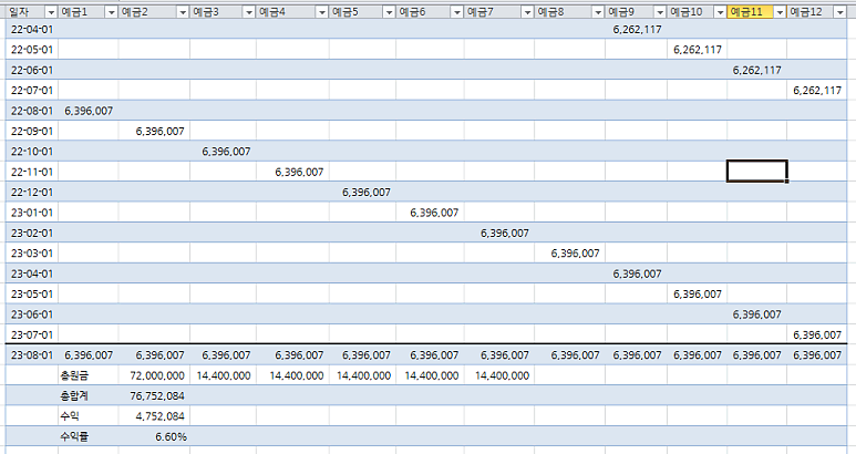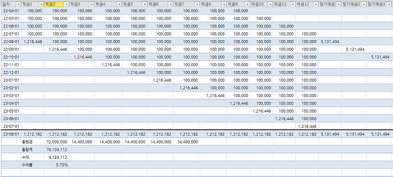 가계부를 통해 소득과 지출을 살펴보고 120만원의 여유자금이 가능하다고 판단되면 이제 부터 어떻게 풍차돌리기를 하는게 좋은지 살펴보자. internet상의 풍차돌리기 적금 방도은 매달 120만원의 여유자금에 맞춤 포커스가 아닌, 매달 하나씩 적금통장을 만드는데 포커스가 있다.그렇다 보니 첫달에 10만원만, 두번쨰달에 20만원을. 세번째달에 30만원을. 마지막 12개월째 120만원을 비로소 적금하게 된다.난 지금바로 매달 120만원의 여유자금이 있는데 이렇게 1년을 기다릴 필요가 있을까?떼문에 기존에 나와 있는 풍차돌리기 적금 보다는 풍차돌리기 예금이 더 실효성이 높다라는 점을 말하고자 한다.진즉 앞서 적금보다는 예금이 더 이익이라고 언급했고 우리는 알고 있다.여유자금이 120만원이 있는데 매달 하나씩 1년을 기다릴 필요가 없다.적금 보다는 예금이 금리 면에서 더 유리함을 알기에 1년을 적금을 붙고 만기되어 나오는 금액을 예금하는 방도을 취할 필요가 없다. 첨부터 바로 120만원을 예금 한다면 된다. 1년 만기로 금리가 제일 높은 상품을 골라서.그렇게 첫달 120만원을 1년 만기로 예금계좌를 개설하고, 다음달 120만원을 예금계좌를 또한 개설한다면,12개월 후에는 12개의 예금 계좌가 만들어지고 13개월차에는 드디어 예금계좌 한개가 만기가 되며, 매달 만기가 도래하는 계좌가 발생한다.여기서 부터는 풍차돌리가 적금과 동일하다.떼문에 매달 여유자금 또한는 저축하고자 하는 금액이 있다면 예금으로 하자.풍차돌리기 예금으로 재테크 하는 재미도 만들고 한푼의 이자라도 더 만들어 보자.시뮬레이션매달 10만원씩 12개의 통장을 만들면서 풍차돌리기 적금 + 13개월차부터 예금 5년 돌리면.수익률은 5년후 5.73%를 얻을 수 있다.(적금금리 3%단리, 예금금리 2.5%복리)반면, 똑같은 금액으로 120만원씩 풍차돌리기 예금으로 5년 돌리면,수익률은 5년 후 6.6%를 얻을 수 있다.(예금 금리 2.5% 복리)풍차돌리기 적금으로 했을 때 보다, 수익률이 0.87%p 더 높은 약 63만원 정도 수익이 더 발생했다.어차피 동일한 120만원 여유자금을 굴린다면 당연히 풍차돌리기 적금 보다는 풍차돌리기 예금으로 시작하는게 더 이익이다.