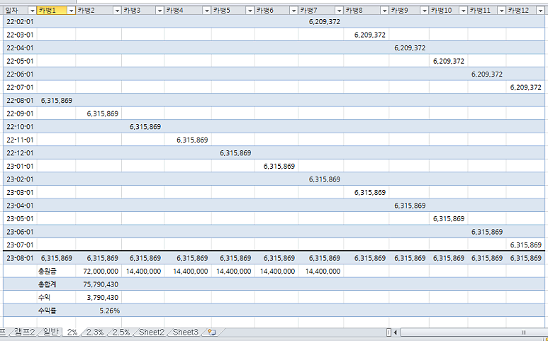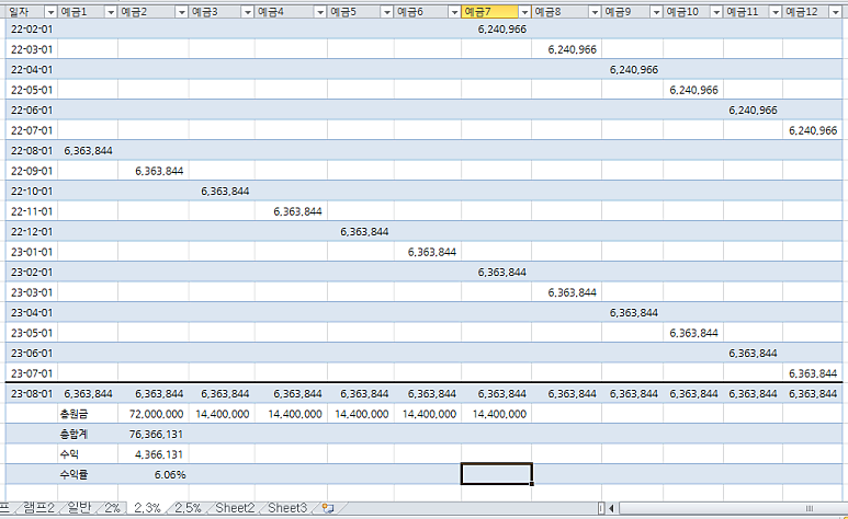 가계부를 통해 소득과 지출을 살펴보고 120만원의 여유자금이 가능하다고 판단되면 이제 부터 어떻게 풍차돌리기를 하는게 이로운지 살펴보자. internet상의 풍차돌리기 적금 방안은 매달 120만원의 여유자금에 맞춤 포커스가 아닌, 매달 하나씩 적금통장을 만드는데 포커스가 있다.그렇다 보니 첫달에 10만원만, 두번쨰달에 20만원을. 세번째달에 30만원을. 마지막 12개월째 120만원을 비로소 적금하게 된다.난 지금바로 매달 120만원의 여유자금이 있는데 이렇게 1년을 기다릴 필요가 있을까?떼문에 기존에 나와 있는 풍차돌리기 적금 보다는 풍차돌리기 예금이 더 실효성이 높다라는 점을 말하고자 한다.앞서 앞서 적금보다는 예금이 더 이익이라고 언급했고 우리는 알고 있다.여유자금이 120만원이 있는데 매달 하나씩 1년을 기다릴 필요가 없다.적금 보다는 예금이 금리 면에서 더 유리함을 알기에 1년을 적금을 붙고 만기되어 나오는 금액을 예금하는 방안을 취할 필요가 없다. 첨부터 바로 120만원을 예금 한다면 된다. 1년 만기로 금리가 제일 높은 상품을 골라서.그렇게 첫달 120만원을 1년 만기로 예금계좌를 개설하고, 다음달 120만원을 예금계좌를 혹은 개설한다면,12개월 후에는 12개의 예금 계좌가 만들어지고 13개월차에는 드디어 예금계좌 한개가 만기가 되며, 매달 만기가 도래하는 계좌가 발생한다.여기서 부터는 풍차돌리가 적금과 동일하다.떼문에 매달 여유자금 혹은는 저축하고자 하는 금액이 있다면 예금으로 하자.풍차돌리기 예금으로 재테크 하는 재미도 만들고 한푼의 이자라도 더 만들어 보자.시뮬레이션매달 10만원씩 12개의 통장을 만들면서 풍차돌리기 적금 + 13개월차부터 예금 5년 돌리면.수익률은 5년후 5.73%를 얻을 수 있다.(적금금리 3%단리, 예금금리 2.5%복리)반면, 똑같은 금전으로 120만원씩 풍차돌리기 예금으로 5년 돌리면,수익률은 5년 후 6.6%를 얻을 수 있다.(예금 금리 2.5% 복리)풍차돌리기 적금으로 했을 때 보다, 수익률이 0.87%p 더 높은 약 63만원 정도 수익이 더 발생했다.어차피 동일한 120만원 여유자금을 굴린다면 당연히 풍차돌리기 적금 보다는 풍차돌리기 예금으로 시작하는게 더 이익이다.