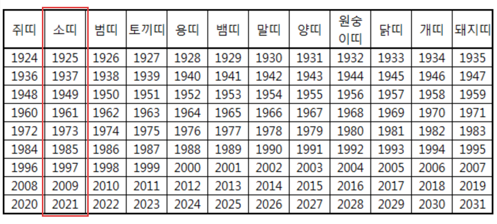 소띠년생 표도 참고로 같이 첨부합니다.