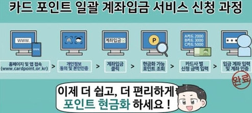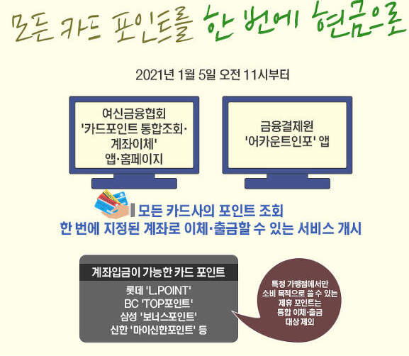 1월 5일 금융위원회는 여신금융협회와 카드사들과 함께 카드 포인트 사용 활성화를 위해서 카드 포인트 통합조회 및 계좌이체 서비스, 카드 자동납부 변경 및 해지 통합 서비스를 도입했습니다.
