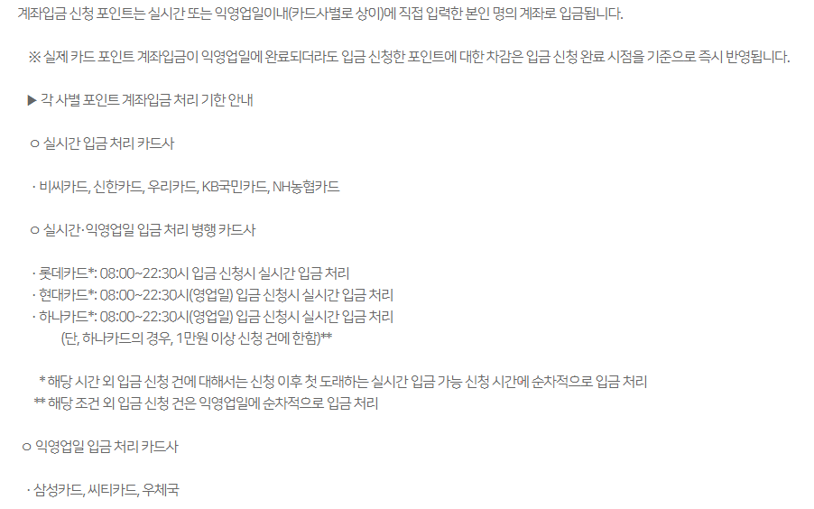 *위에 기재되지 않은 카드사의 경우에는 해당 카드사에 직접 계좌입금 신청을 해야합니다.