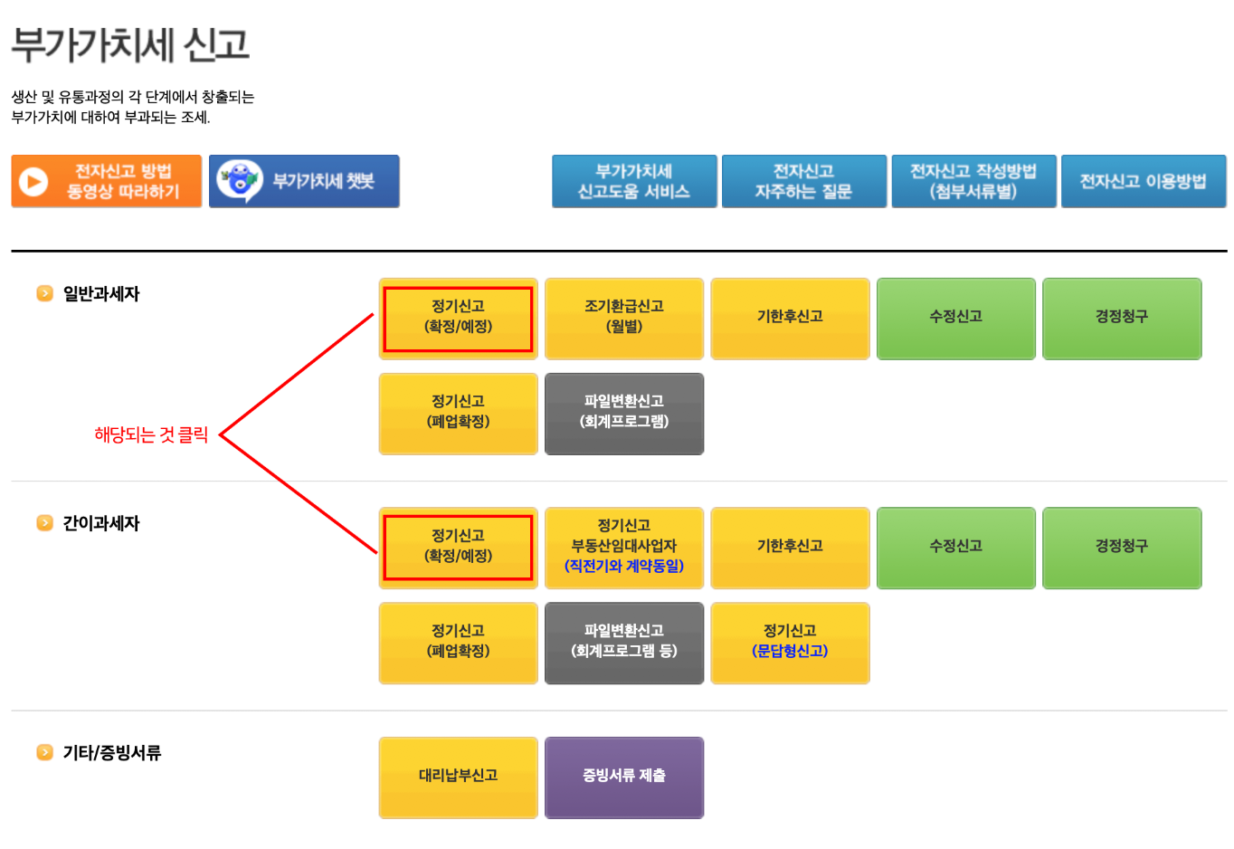 4. 신고/납부 메뉴에서 부가가치세 > 정기신고(확정/예정) 탭을 선택합니다.