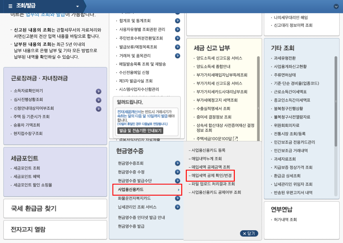 2. 조회 / 발급 메뉴에서 사업용신용카드 > 매입세액 공제 확인/변경 메뉴를 선택합니다.