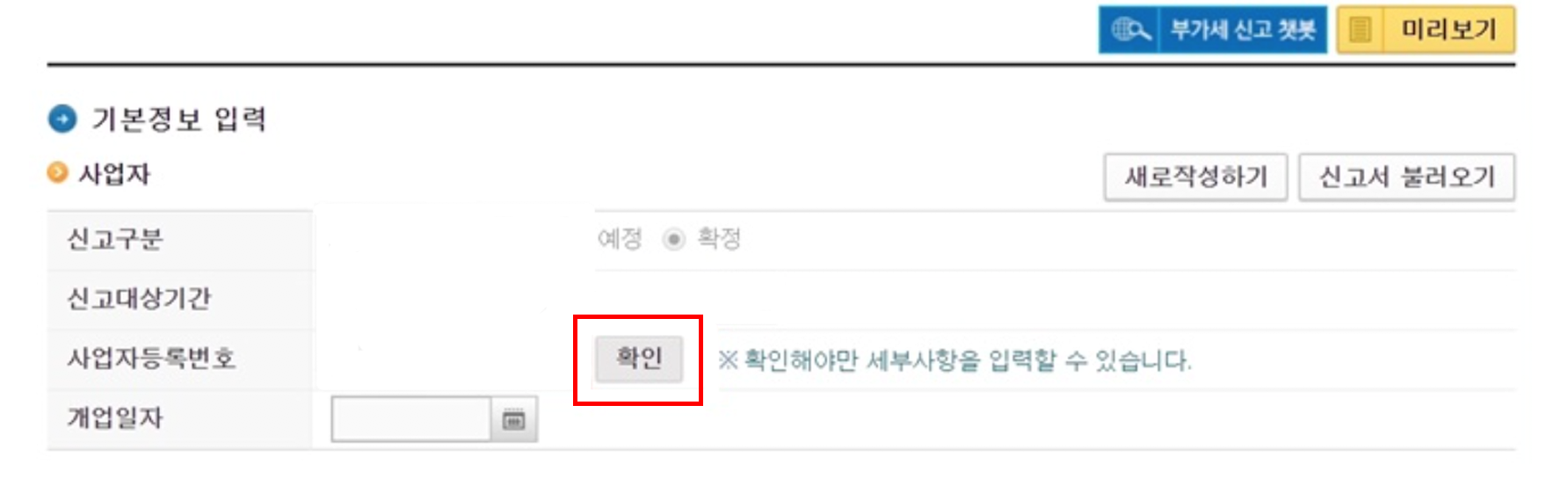 사업자를 확인한 후 옆에 있는 ‘확인’ 버튼을 클릭하여 기본사항을 입력합니다. 기본사항이 자동으로 입력된 것을 확인하고 저장 후 다음이동 버튼을 클릭합니다.