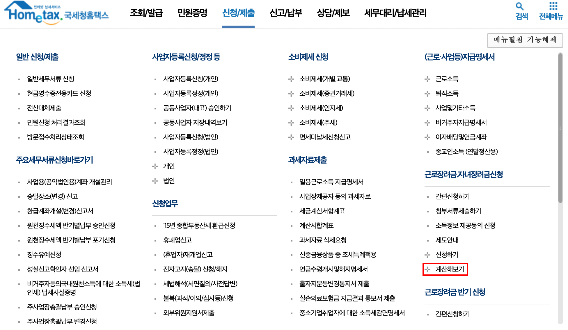 2. ‘신청/제출 메뉴 > 근로장려금. 자녀장려금 신청 > 계산해보기’를 클릭하시어 조회해볼 수 있습니다.