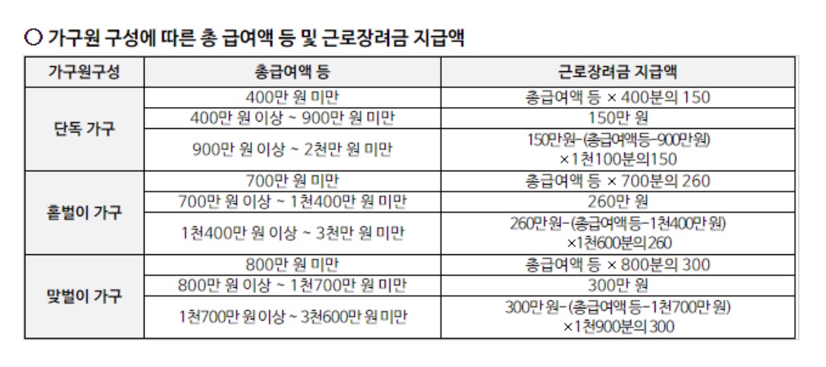 근로장려금은 소득활동을 함에도 불구하고 소득이 적어 생활이 어려운 근로자나 사업자 또는 종교인 가구에 대해 가구원 구성과 총급여액 등에 따라 산정된 금액을 지급하는 것을 말합니다. 근로장려금을 정부에서 지급함으로써 근로활동을 장려하고 실질소득을 지원하는 근로연계형 소득지원 제도라고 합니다. 근로장려금은 신청자격만 충족되면 누구나 신청할 수 있는 제도이지만 가구원 구성에 따라 정하여진 총급여액을 기준으로 산정됩니다.